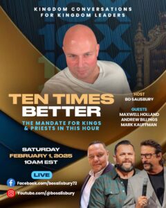 Join me alongside host Bo Salisbury and fellow guests Maxwell Holland and Andrew Billings for an important live discussion on Ten Times Better “The Mandate for Kings & Priests in This Hour.”